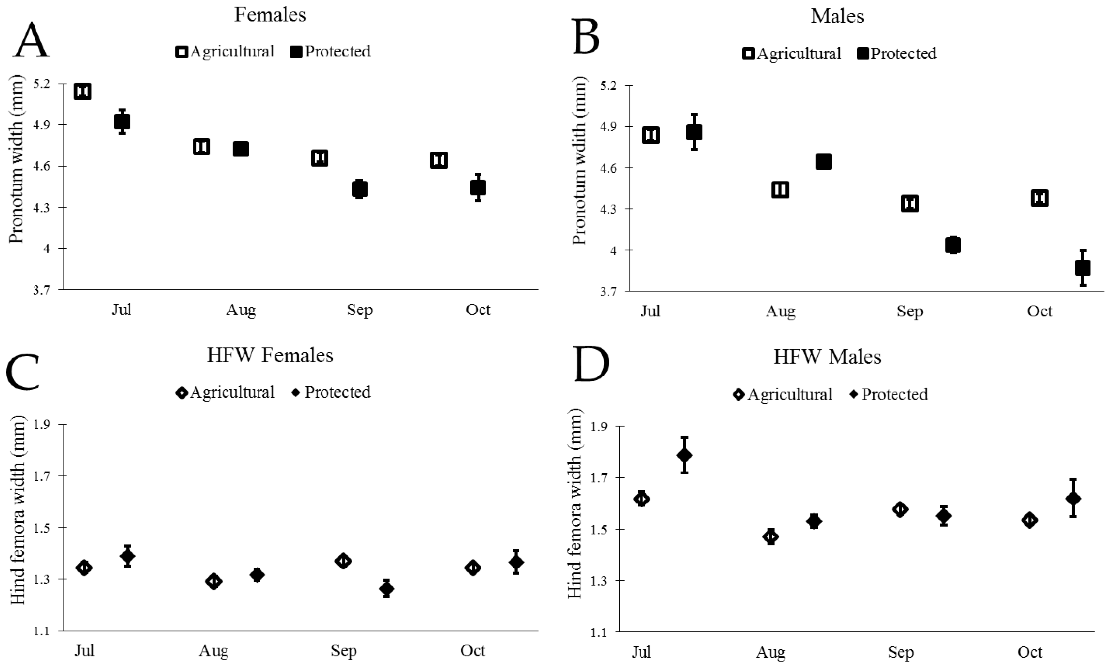 Male N. femorata appear to be particularly sensitive to poor nutrition [45]. Here, both males and females captured later in the season were smaller than those measured earlier, yet males were affected to a greater extent than females (Figure 4). In July at the Protected Site, males were large with large sexually-selected weapons (Figure 4B,D). Sexual size dimorphism was minor at this time, with females marginally bigger than males (Figure 5). Yet, males in July had much larger hind femora than females (Figure 5). By October at the Protected Site, females were much larger than males and the dimorphism in the sexually-selected weapon shrank (Figure 5). Interestingly, the weapon size of males decreased relative to male body size so that there was a shift in the allometric scaling relationship (Figure 4D). Males in October were not only tiny, but they had especially tiny hind femora relative to males in July. The size of female hind femora relative to body size also changed across the months, but the shifts were subtle (Figure 4C).