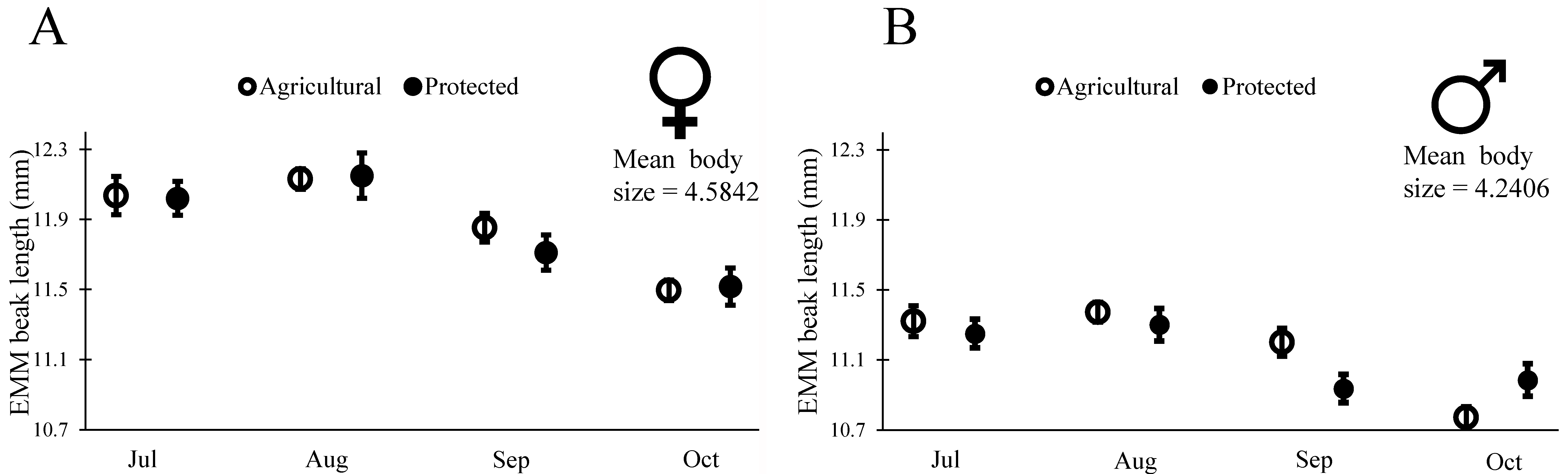 We examined body size and weapon size in our wild population of insects using a generalized linear model with site and month as categorical explanatory variables. We ran separate models for males and females given the known sexual size dimorphism in this species [45]. We first examined the effects of site (Agricultural Site, Protected Site), month (July, August, September, and October), and site × month on body size and weapon size separately. We next constructed a model to test for changes in the size of weapon size relative to body size (i.e., body shape differences). We built the initial models with body size as a continuous covariate, site and month as categorical factors, and all two-way interactions of site, month, and PW. Two-way interactions where p > 0.10 were removed from models using a sequential elimination procedure [55]. We calculated the sexual dimorphism indexes (SDI) of the body size and the weapon size of insects measured in the wild and the SDI of beak lengths from the separate group of insects measured in the lab (see above). To calculate the SDI, we divided the average female trait size by the average male trait size per month per site and subtracted 1 [48].