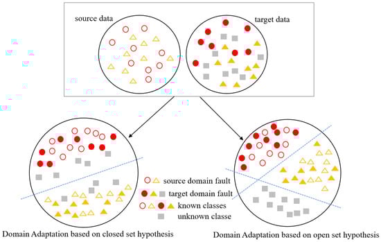 To address the distributional differences in bearing fault data arising from various working conditions, many methods employ domain adaptation techniques. Domain adaptation can fully leverage the information from both the source and target domains to minimize the differences between distributions across different domains to the greatest extent possible. These approaches will be reviewed in detail in Section 2. However, the traditional domain adaptation methods have not effectively addressed the domain shift problem caused by the presence of unknown classes in the target domain. Therefore, a practical fault diagnosis model not only needs to align the distributions of shared categories of the two domains but also needs to have the ability to detect unknown classes, which is referred to as open set domain adaptation (OSDA) for fault diagnosis.