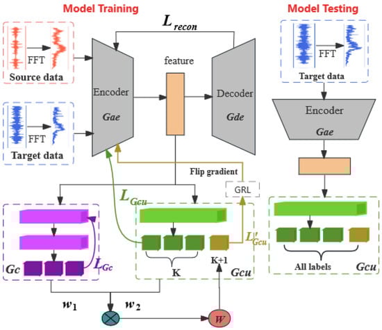 Here, and represent the parameters of the and the , and symbolizes the quantity of samples in the source domain. The common cross-entropy loss function used to reduce the error is denoted by . and represent the labels corresponding to the samples in the source domain .