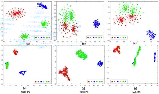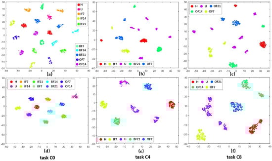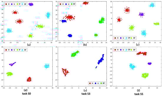 To visually validate the performance of the proposed approach in domain adaptation under the open set assumption, we utilized t-SNE visualization. Here, U represents unknown fault samples. We obtained the t-SNE visualization results shown in (a), (b), and (c) of Figure 3, Figure 4 and Figure 5 by transforming the time-domain data into frequency-domain data using the FFT method. Additionally, the t-SNE visualization results shown in (d), (e), and (f) of Figure 3, Figure 4 and Figure 5 represent the high-level features learned by the feature extractor module from the source and target domain data. Three representative sets were selected from each dataset for visualization. These results demonstrated the visualization comparison before and after domain adaptation based on the open set assumption for tasks C0, C4, and C8 from the CWRU dataset; S0, S3, and S5 from the SEU dataset; and P0, P1, and P3 from the PU dataset in the source and target domains.