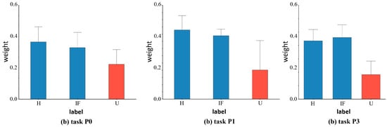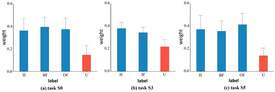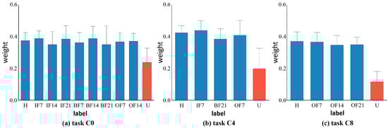 We also depict the weights learned from the known and undiscovered fault categories in the target domain for the various datasets to further support the efficacy of our suggested weight-based technique. Figure 6 illustrates the corresponding weight values of target domain samples for tasks C0, C4, and C8 in the CWRU dataset. Figure 7 shows the corresponding weight values of target domain samples for tasks S0, S3, and S5 in the SEU dataset, and Figure 8 shows the corresponding weight values of target domain samples for tasks P0, P1, and P3 in the PU dataset. If the samples between the target and source domains have the same health status labels, they will have a higher weight. On the other hand, for target outlying classes, i.e., unknown fault classes, lower weights are assigned. For example, for Task C8, the target domain labels included normal bearings (H), outer race faults with 0.007 inches diameter damage (OF7), outer race faults with 0.014 inches diameter damage (OF14), and outer race faults with 0.021 inches diameter damage (OF21). The weights learned by the corresponding samples fluctuated above 0.4, indicating that they had obtained high-level weight values, thus had high similarity with the source domain’s fault categories, and were more focused on the learning process of domain adaptive alignment of shared category samples. The learned weights roughly fluctuated below 0.2, with low weight values for unknown fault samples (U) in the target domain. They did not correspond with shared category samples and were therefore less frequently taken into account in the cross-domain distributions. The target domain samples’ weight visualization findings demonstrated comparable learning in other tasks. The visualization of the weight maps verified the effectiveness of similarity weights, which combine known and unknown classes, as a weighting method in our proposed domain adaptive process of bearing fault diagnosis.