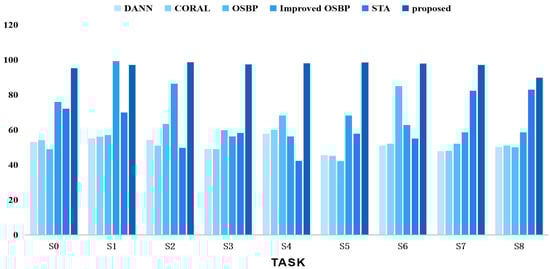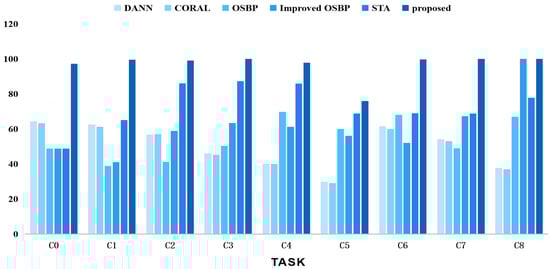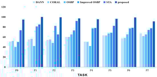 We also conducted comparative experiments using different task settings of the CWRU, SEU, and PU datasets against other classical methods such as DANN [], CORAL [], OSBP [], improved OSBP [], and STA []. The results are shown in Figure 9, Figure 10 and Figure 11, comparing the comprehensive performance of the representative domain adversarial methods and the proposed method. In summary, our proposed strategy outperformed the competing methods in the related tasks.