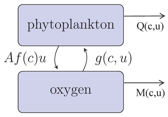 where c is the concentration of the dissolved oxygen, u is the density of phytoplankton and t is time. Function describes the combined effect of the oxygen production inside the phytoplankton cells and its transport from the cells to the surrounding water. Note that, since the transport through the cell membrane depends on the concentration in the vicinity of the cell, f appears to be a monotonously-decreasing function of c; see [] for details. Parameter A takes into account the effect of the environmental factors (such as the water temperature) on the rate of oxygen production inside the phytoplankton cells. We assume that both plankton and oxygen are distributed approximately uniformly in the upper layer of the ocean (the so-called approximation of a well-mixed layer, cf. [,]); hence, Equations (1) and (2) do not include space.
