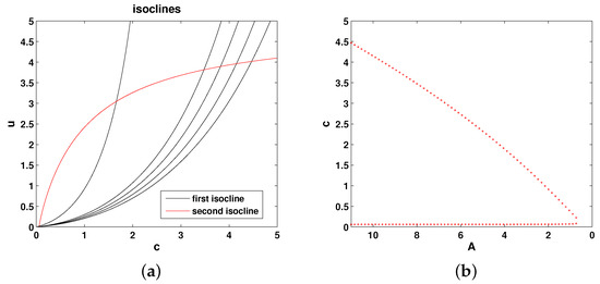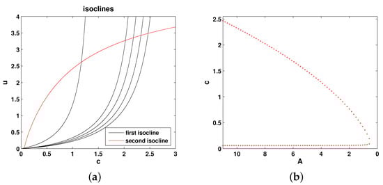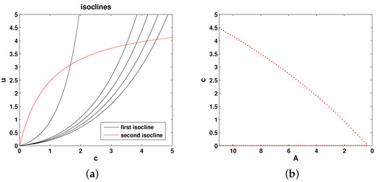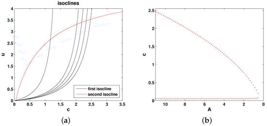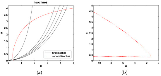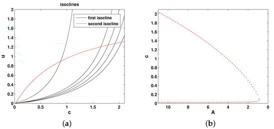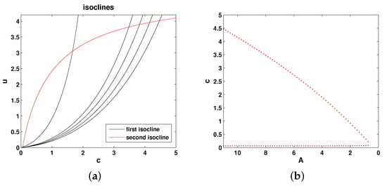 Figure 2a shows the relative position of the isoclines in the phase plane of the system. Any intersection between the two isoclines (i.e., between the red and black curves) is a steady state. It is readily seen that the positive steady states only exist if A is not too small. In case A is smaller than a certain critical value, say , there are no positive steady states. This can be summarized as a bifurcation curve showing the steady state values of oxygen vs. A; see Figure 2b. For any , there are two steady states, as shown by the two branches of the curve (where corresponds to the right-most point in the dotted red curve). It can be shown [] that the upper steady state is stable and the lower steady state is unstable. At , the two branches merge.