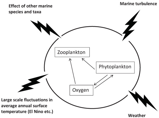 Equations (26) and (28) are known to predict a catastrophic response of the plankton-oxygen system to a sufficiently large change in parameters A or []. In case A and/or change with time, e.g., as a result of global warming, the plankton densities and oxygen concentration would first show a slow decrease that eventually turns into a fast decay to the extinction/depletion state [,]. However, Equations (26) and (28) are deterministic: as long as the parameters and the initial conditions are known precisely, their solution gives the state of the system at any given time t. This is not entirely realistic, in particular because the environment is never exactly stationary, which means that at least some of the parameters in Equations (26)–(28) may not be constant, but change with time. The environment often changes or fluctuates in a complicated manner, which is loosely referred to as the environmental stochasticity or environmental noise (Figure 9). It is well known that the environmental stochasticity can affect the corresponding population dynamics significantly []; in particular, under certain conditions, it may lead to species extinction [,].