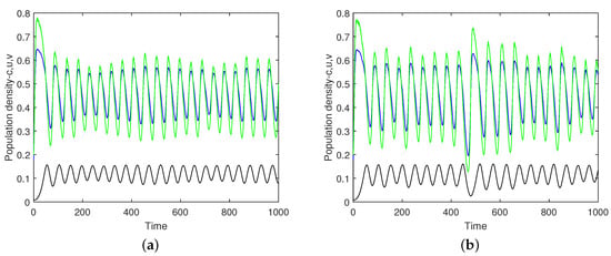 Equations (26)–(29) with Equation (31) were studied by means of extensive numerical simulations. The numerical scheme was carefully checked and tested in order to avoid numerical artefacts. To reveal the effect of noise on the system’s dynamics, we first consider a special case where the stochasticity only affects , but not A, so that . Furthermore, we consider that there is now global change, i.e., . We choose the value of other parameters such as the system without noise exhibits periodic oscillations due to the limit cycle (see [,]), namely and . Typical simulation results are shown in Figure 10 (obtained for the initial conditions and ). We readily observe that, due to the effect of noise, the solution becomes quasi-periodical rather than periodical. Note that, due to the randomness in , each simulation run is different: the apparently different solutions shown in Figure 10a,b are obtained for exactly the same parameters and initial conditions.