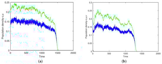 The effect of noise on the system’s dynamics is seen particularly well for the parameter values close to the boundary of the system’s sustainability range (cf. the end of Section 3). One example is shown in Figure 12 (obtained in the zooplankton-free case, , for parameters , , , , , and the initial conditions , ). We first notice that the generic prediction of the deterministic Equations (26)–(28) remains valid: over the course of time, a gradual decrease in the oxygen concentration and plankton density changes to a fast decay resulting in the extinction/depletion catastrophe. Figure 12a,b shows two simulation runs performed for exactly the same parameters and initial conditions; hence, any difference is attributed to the inherent stochasticity of the system. In the case shown in Figure 12a, the average values of the oxygen concentration and the phytoplankton density decrease slowly up to when this slow dynamics changes to a fast decay, resulting in the plankton extinction and oxygen depletion at . In the case shown in Figure 12b, the dynamics exhibits similar features, but the timing is different; in particular, the extinction/depletion occurs at .