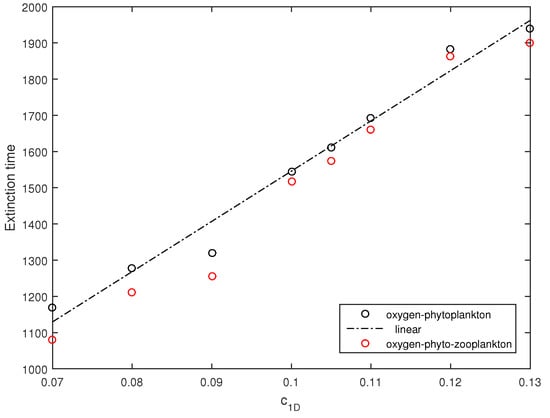 Average extinction time calculated for different values of for the oxygen-phytoplankton model (, black circles) and the full oxygen-phyto-zooplankton model (, red circles). Other parameters are the same as in Figure 12. The black dashed-and-dotted straight line shows the best-fit of the data by a linear function.