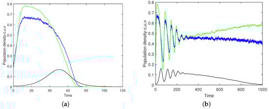 This intuitive expectation is confirmed by simulations. Figure 14 shows the oxygen concentration and the plankton densities versus time obtained for , (this value of being very close to the upper boundary of the safe parameter range), and . Panels (a) and (b) correspond to different simulation runs performed for exactly the same values of the parameters and initial conditions. It is readily seen that, whilst for the simulation run shown in Figure 14a, the system quickly converges to the extinction/depletion state, for the run shown in Figure 14b, the system’s dynamics is sustainable (exhibiting a decay in the zooplankton density, but keeping safe numbers for oxygen and phytoplankton), at least over the given time interval.