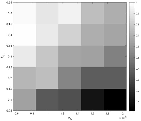 The outcome of stochastic dynamics can be quantified by the probability of different events. In order to achieve this, for every point in a grid of parameter values and , we performed fifty simulation runs and counted the probability of extinction (e.g., a probability of 2% means that the extinction was observed only once). The results are shown in Figure 15. It is therefore readily seen that the probability of oxygen depletion shows a clear tendency to increase with a decrease in and with an increase in , i.e., from the right bottom corner to the left top corner. Although this dependence on the rate of change may look somewhat counterintuitive at first sight, a heuristic explanation is straightforward: the slower the change, the longer the system stays in the vicinity of the critical value of A before being taken sufficiently far away, and hence, the higher is the probability that the noise pushes the system to catastrophe.