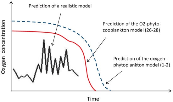 In studies aiming to understand the consequences of global warming, mathematical modelling has long been used as a powerful research tool [,,,]. Models of climate dynamics are usually very complicated [] (but see []): indeed, a predictive model should account for many factors and processes occurring in the environment. In contrast, our model is very simple; however, it is by no means just a mathematical toy. It has been shown in [] that the three-component oxygen-phyto-zooplankton model given by Equations (26)–(28) provides an upper bound for a class of much more complicated (and much more realistic) food web-type marine ecosystem models. This means that, whenever the plankton extinction/oxygen depletion happens in the simple model (26)–(28), it necessarily happens in the more realistic model (Figure 16). Therefore, although Equations (26)–(28) do not have the power to predict the details of the ecosystem dynamics, they do have the power to predict the possibility of an extreme event such as a global oxygen crisis due to the disruption in the oxygen production. Moreover, using the same mathematical technique (called the comparison principle for differential equations; see [] for details), it is readily seen that the extremely simple model given by Equations (1) and (2) actually provides a further upper bound limiting the solutions of the three-component model Equations (26)–(28); see Figure 16.