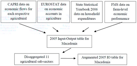The agricultural sector was disaggregated into 11 sub-sectors using the [] disaggregation procedure. Besides the 2005 IO table for Macedonia [], data on the economic flows to each agricultural production enterprise obtained from the Common Agricultural Policy Regionalized Impact model (CAPRI) (More information about CAPRI may be found at: http://www.capri-model.org/dokuwiki/doku.php?id=start); the EUROSTAT data on economic accounts for agriculture; the Farm Monitoring Survey (FMS) (The Farm Monitoring System (FMS) is an annual survey carried out by the Macedonian National Extension Agency, gathering farm return data from around 300 farms, in line with the Farm Accountancy Date Network (FADN) principles) on farm performance; and papers and reports published by the State Statistical Office (SSO) in Macedonia were used in the disaggregation procedure (Figure 1).