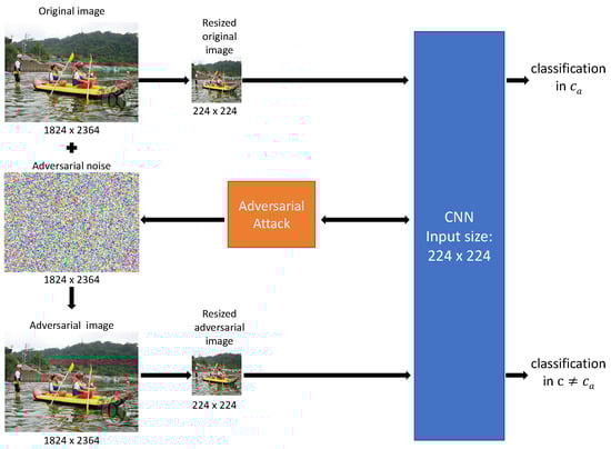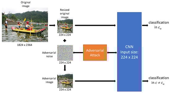 To perform image recognition, CNNs start their assessment of any image by first resizing it to its own input size. In particular, high-resolution images are scaled down, say to or for most CNNs trained on CIFAR-10, respectively on ImageNet []. Until recently (and still now), to the best of our knowledge, attacks are performed on these resized images. Consequently, the resulting adversarial images’ size coincides with the CNN input’s size, regardless of the size of the original images. Figure 1 describes this standard approach, in which attacks take place in the low-resolution domain, denoted as the domain in this paper.