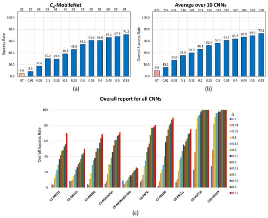 Evaluating the performance of the noise blowing-up method for EA in untargeted scenarios with the increased strength of adversarial images per each CNN. The charts display values at the bottom, along with the corresponding number of images used for the tests at the top.