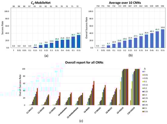 Evaluating the performance of the noise blowing-up method for AdvGAN in target scenarios with the increased strength of adversarial images per each CNN. The charts display values at the bottom, along with the corresponding number of images used for the tests at the top.