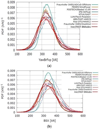 Analysis Results for Load Case 2.4b of OC4 Phase I. (a) PDF_Tower-Top Fore-Aft Shear Force; (b) PDF_Fore-Aft Shear Force at Mudline; (c) DEL_Fore-Aft Shear Force at Mudline. PDF: Power Density Function; BSX: Fore-Aft Shear Force at Mudline; DEL: Damage Equivalent Load.