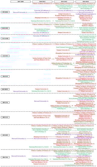 In Figure 3, it illustrates that two assignees from enterprises and eighteen assignees from universities and research institutes. These two patentees from enterprises are Lockheed Martin Corporation from the U.S. and Samsung Electronics Co., Ltd. from Korea. It should be recognized that assignees from China are all belong to universities and research institutes, which suggest a lack of Collaboration among enterprises, universities, and research institutes. As for geographical location, China (12 assignees) overtakes Korea (5 assignees), and the U.S. (3 assignees), and takes the lion’s share, indicating its principle role in graphene biomedical technology. The top three assignees regarding the number of patents are Chinese Academy of Sciences (33), Guangxi Chinese Medicine College (29), and Seoul National University (24). These assignees situated in the lower right quadrant, indicating their competitive advantages in patenting activities. Harvard University, Chinese Academy of Sciences, and Lockheed Martin Corporation have relatively higher technological innovation capability in patent strength, locating in the lower right quadrant. Lockheed Martin Corporation, holding 12 patents, is situated relatively close to the area of the upper right quadrant. This indicates that Lockheed Martin Corporation has a relatively high competitive advantage in technical strength and resources, and plays a crucial role in the future TC. It is clearly shown that there are no assignees situated in the area of the upper right quadrant, which indicate that currently no assignee is the technological and marketable leader with competitive advantage over patent activities as well as resources. Samsung Electronics Co., Ltd. is the only competitor situated in the upper left quadrant, which shows its distinct competitiveness in company resources, so it is challenger in graphene biomedical technology and will become a potential buyer. More than half of the patentees are still situated in the lower left quadrant. Most of the Chinese assignees with relatively lower technological innovation capability are situated in this quadrant. For example, although Jiangsu University, Zhengzhou University, Fudan University, and Shanghai University ranked the top 10 in owning patents, their ability in company resources is relatively low. Lacking technological strength as well as company resources, these Chinese assignees are followers.