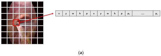 Difference between the first version (a) and the second version (b) of You Only Look Once (YOLO): input image is divided into grid cells (S × S). Then, prediction of each grid cell is encoded as a tensor. x and y are the center position, and w and h are the width and height of each bounding box. p is the probability of whether it is an object or not, and pc is the probability corresponding to each class.