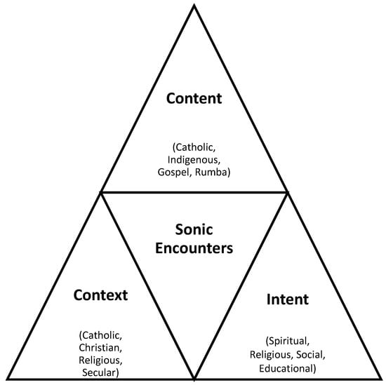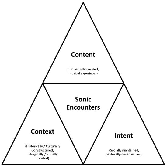 In order to explore this proposition further, I am drawn to two distinct but related triangulations of musical and ritual processes. The first was proposed by () in his seminal publication “Toward the Remodeling of Ethnomusicology”. Drawing on () interpretation of symbolic systems, Rice proposes a tripartite understanding of musical processes as historically constructed, socially maintained and individually created/experienced. In other words, music is contextualized by where it comes from; maintained according to the values of communities of practice; and created (and experienced) by individuals within these communities. Similarly, in the 1972 Post-Vatican II document of the U.S. Bishops’ Committee on the liturgy “Music in Catholic Worship (1972)”, the value of the musical processes and repertoires in liturgical celebration is proposed as determined according to a three-fold judgment based on musical, liturgical and pastoral considerations (). I have combined these two models to create a new model, exploring Elikya’s musical processes under the headings of context, content and intent (See Figure 1).