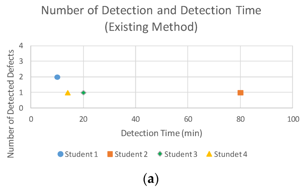 Figure 16 and Figure 17 show scatter plots of the results for each student. Using our method, the detection time decreased for all students. In addition, Student 2 detected more defects, whereas Students 1, 3, and 4 detected the same number of defects using both methods. As for the correction time, the second method (i.e., our method for students 1 and 2, and the existing method for students 3 and 4) required less time regardless of which method was used.