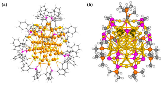 (a) Single crystal XRD structure of Au70S20(PPh3)12 from [], reproduced with permission, Royal Society of Chemistry, 2017; (b) The optimized structure of Au70S20(PCH3)12 cluster. The cluster is obtained at the PBE0/LanL2dz(Au) and 6-31G *(S, C, P, H) level of theory. Au, yellow, S, purple; P, orange; C, gray, H, white.