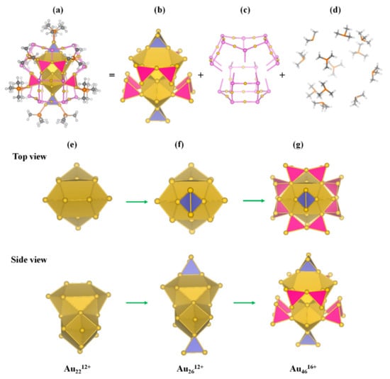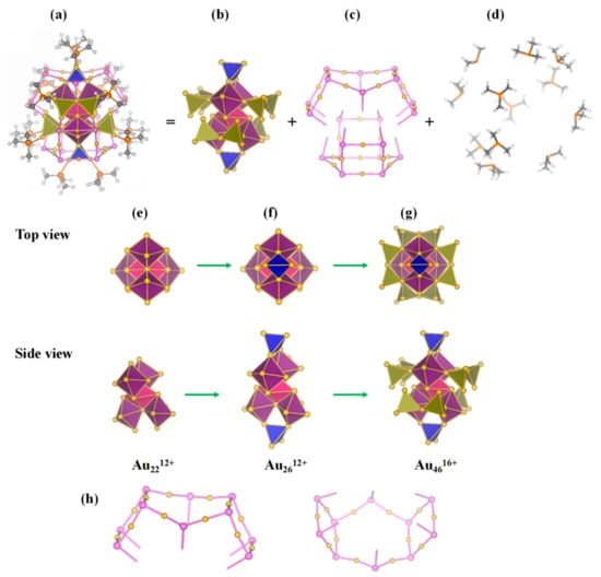 (a) Structural model of Au70S20(PCH3)12. The [Au12(µ3-S)10]8− and PCH3 protecting motifs are given as ball-and-stick models (Au, yellow; P, orange; S, pink; C, gray; H, white). The Au cores are shown as polyhedra. (b) Model of Au4616+ core, (c) Two [Au12(µ3-S)10]8− staple motifs, (d) Model of twelve PCH3 protecting motif, (e) Au2212+ superatomic molecule, (f) Au2612+ core, (g) Au4616+ core.