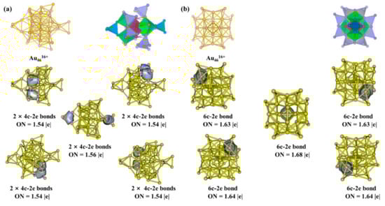 In order to verify the electronic structure of Au70S20(PCH3)12 cluster, we carried out chemical bonding analysis. The electronic structure of the cluster followed the SAN model, that is, it had a network of fifteen 2e-superatoms, abbreviated as 15 × 2e SAN, which contained five 2e-Au6 and ten 2e-Au4 superatoms. We took the Au4616+ core out of the cluster separately while keeping the structure identical to that in Au70S20(PCH3)12 cluster to analyze the chemical bonds. As expected, AdNDP analysis in Figure 4 indicated that there are 10 four-center-two-electron (4c–2e) bonds with occupancy numbers (ON) = 1.54−1.56 |e|, five 6c−2e bonds with ONs = 1.63−1.68 |e|. Vertex-sharing Au4 superatoms were present in the experimentally determined Au20(SR)16 and Au36(SR)24 clusters [,].