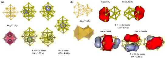 (a) Structure, superatom-network model and AdNDP localized natural bonding orbitals of Au2212+ core. (b) Structure, superatomic molecular model and AdNDP localized natural bonding orbitals of Au2212+ superatomic molecule.