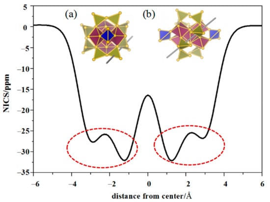 NICS-scan method is proposed by Stanger, which is similar to the screen method of aromatic center and has been used to predict the aromatic properties of molecules and clusters [,,]. Here, we use NICS-scan method to further verify the existence of Au4 superatoms and we have demonstrated the existence of Au4 superatoms in Au20(SR)16, Au28(SR)20 and Au30S2(SR)18 clusters in our former work [,]. Figure 6 is the NICS-scan curve of Au4616+ core along the centers of two neighboring Au4 superatoms in the range of −6.0–6.0 Å. The position of NICS(0) is set at the midpoint of the geometric centers of two Au4 superatoms. Two views of the scan in Au4616+ have been given in the figure. Considering the symmetry of Au4616+, we only give one scan curve of the cluster. It is obvious that there are two dotted ovals in the figure, indicating two non-conjugate Au4 superatoms, which further support the SAN model. The NICS(0) values of the two Au4 superatoms are both −32.2 ppm much smaller than benzene molecule (−9.7 ppm), indicating strong aromaticity. The NICS-scan method is applied to verify Au4 superatoms in Au4616+ core, thus the Au4 superatoms are further verified from the aromatic view.