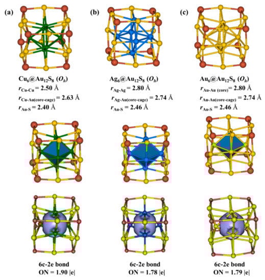3.4. Cu6@Au12(μ3-S)8, Ag6@Au12(μ3-S)8, and Au6@Au12(μ3-S)8 Clusters