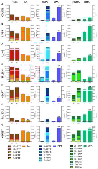 PUFA and lipid metabolite profile in organs of wildtype and fat-1 mice. Lipid metabolites and their precursor PUFAs (HETE and AA—left column; HEPE and EPA—middle column; HDHA and DHA—right column) in colon (A); liver (B); lung (C); spleen (D); heart (E); skeletal muscle (F) and kidney (G) from wildtype and fat-1 mice. Significant differences in PUFA levels between wildtype and fat-1 mice were shown as * p < 0.05, ** p < 0.01 and *** p < 0.001. The p-values for the differences of individual monohydroxy lipid metabolites in panels (A–G) are presented in the supplementary material (Tables S2–S8).