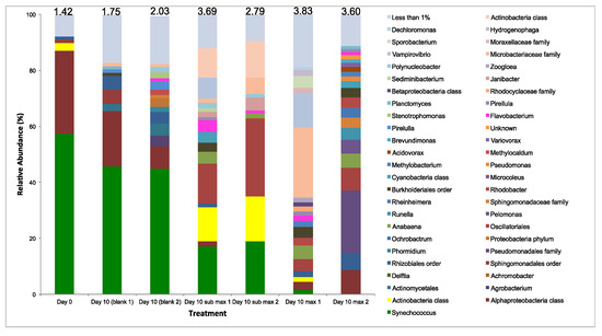 In regards to the microbial community composition, Figure 4 shows the relative abundance of bacterial and eukaryotic biota in the WRP (day 0), where no harvesting (control) was performed, and where sub-maximum and maximum harvesting (after 10 days) were undertaken. The average number of reads for these samples was 67,687 with a mean length of 414 base pairs. A scatter plot of coordinates (PCoA) groups diversity between biological replicates, providing confidence in the results (Figure S2). Most notably, bacterial diversity was dominated by the cyanobacterium Synechococcus in the WRP (day 0) and the control samples (day 10). Sub-maximum harvesting reduced this by more than 2-fold, and their presence was all but eliminated in the maximum harvesting samples. This resulted in an increase in diversity, reflected by an increased Shannon diversity index. Interestingly, the population identities were very different between the replicate maximum harvesting samples after 10 days incubation (Figure 4). Eukaryotic diversity showed clear dominance from the Chlorophyta class in all samples (Figure 4). These results were less clear to interpret due to the high number of sequences that were not matched and the high level of variation between biological replicates illustrated by PCoA analysis (Figure S2).