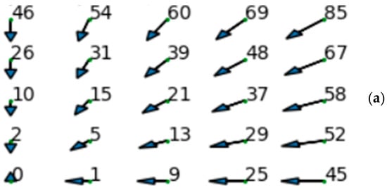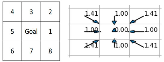 where stands for the shortest distance from to the goal. represents the distance between the center of cell 37 and the waypoint In contrast with other methods [], the optimal traveling distance from cell 37 does not need to pass through the center of neighbors 13 or 21; instead, it can find the optimal, accurate moving direction.
