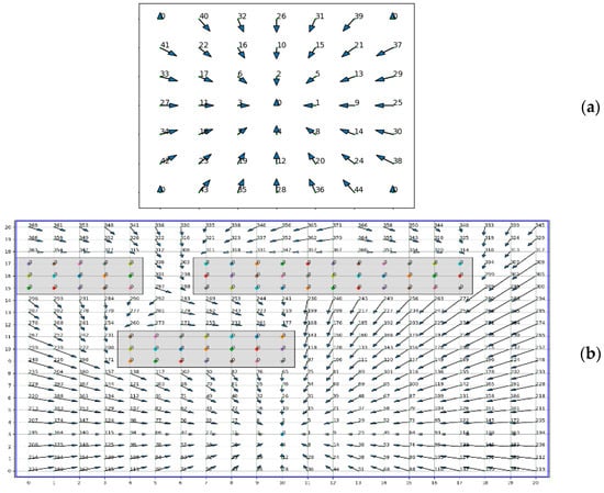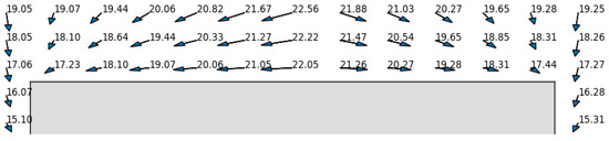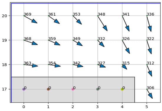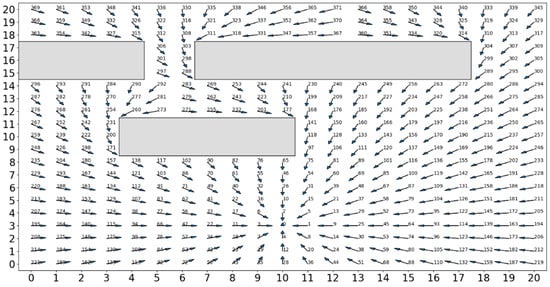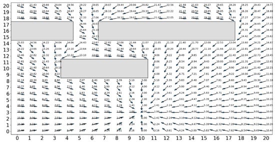 Shortest distance (the number before each arrow) and optimal moving vector (each arrow) fields of the map (x, y axes: indices of cells).