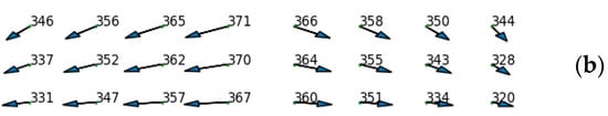In Case II, we considered the robot position P, which is close to the ridge boundary as shown in Figure 6b, where there are several waypoints in the neighborhood. Some potential, optimal directions guide the waypoint on the left while others guide the waypoint on the right. Similar to Case I, we first calculated the waypoint set from all valid neighbors. Next, we minimized the distance from the point to the goal in order to obtain the best waypoint as follows.