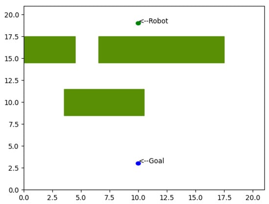 In the last decade, DRL has been successfully applied to more and more applications. DRL performs better than human players in various fields by trying different strategies. In particular, DRL has been successfully used in mobile robotics or automated vehicle motion planning [,,,,,,,,,,]. For example, in [], the authors investigated the performance of a DRL-based deterministic policy gradient method for the dynamic environment. The algorithm was applied to multiple vehicle path planning. In [], the authors studied a complex, big environment in which conventional algorithms often result in failures. They used a DRL-based algorithm to map vehicle’s control actions to sensory inputs []. In []. The authors focused on a mixed environment and used DRL for vehicle motion planning. This algorithm was used for automated, multi-vehicle scenarios. In addition, by understanding and predicting the motions of moving obstacles using the equipped sensors, DRL can be programmed to avoid dynamic obstacles []. The elements of social interaction were introduced to DRL [], where social rules were used to guide DRL. When we consider non-communicating multi-agent path planning problems, traditionally, the computation time can be prohibitively long due to unobservable agents’ goals. However, DRL can be effectively used to reduce online computation time [] and enable real-time navigation. While it is more challenging for DRL to avoid collision when the dynamic obstacles or agents do not follow any behavior rules, we can mitigate this issue by adding an LSTM segment for flexible observation size. This allows the DRL algorithm to achieve a better performance as the number of mobile obstacles increases []. A proposed method with low computation time and low energy consumption while achieving optimal or close to optimal path formulates a clustered IoT network as a combinatorial optimization problem. The authors in [] used a seq2seq network and DRL to train this network using information of the clusters and the UAV’s start or end as the input. In [], the authors introduced a new combination of elite-duplication genetic-assisted path planning with DRL. Using this method, they can optimally generate sparse waypoints in a constrained space. In practical path planning applications, such as for warehouse robots, there are multiple agents. To address this problem, in [], the authors formulate the problem as a decentralized, partially observable Markov decision process and use a DRL approach to solve the problem by feeding global and local map representations into convolutional layers.