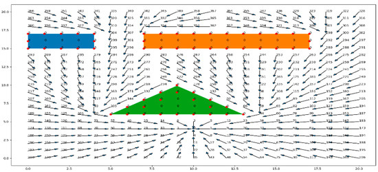 To demonstrate the efficacy of the proposed method, we carried out the experiments for two typical scenarios with multiple obstacles. In Figure 8, we show the calculation order for the cell distance propagation. Every number before each arrow shows the order by which the cell is travelled. In Figure 9, we show the shortest travelling distance (i.e., the number before each arrow) from the goal position to each cell. In these two figures, every arrow represents the optimal moving direction for the center of the cell to the goal. The goal position is represented by a triangle with zero distance. Obstacles are represented by rectangular shapes. For any point in the free workspace, based only on the shortest distances and optimal moving directions of local neighbor cells as shown in Figure 9, we can efficiently calculate the corresponding optimal moving direction (i.e., action) and the shortest distance from the point to the goal position in order to navigate the robot to advance along the optimal path to the goal.