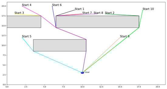 Path planning is a research field studying the moving strategies of robots or vehicles. In path planning, the goal is to safely move an agent from a start position to its corresponding final destination while evading any obstacles or other agents [,,,]. With numerous applications, such as improving robot movement efficiency and safety, increasingly efficient and powerful algorithms have been developed. To this end, research has been focused on optimal path planning, which can be defined with one or more of the following constraints: shortest time [], shortest distance [], and optimal energy consumption [].