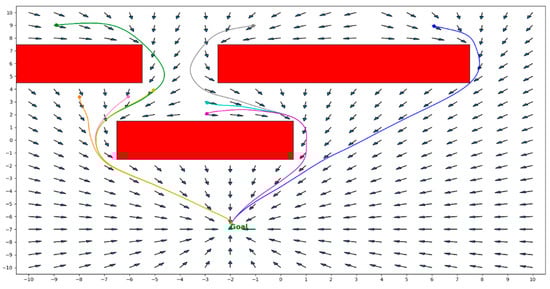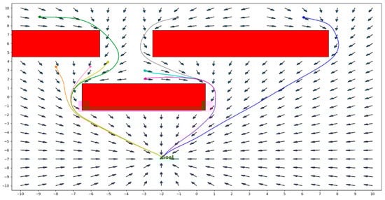By using the navigation algorithm described in Section 3.1.2, we randomly selected multiple starting points and computed their optimal trajectories, as shown in Figure 12 and Figure 13. From any beginning point, the vehicle can move along the shortest traveling path all the time. These optimal trajectories can be sampled and fed into the two-stage DRL for training.