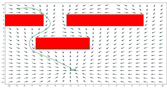 To evaluate the effectiveness of our method, we used our method in typical motion planning scenarios with multiple obstacles. The vehicle would be able to travel from any beginning position in the workspace and reach the goal position without colliding with any obstacles. One typical scenario is shown in Figure 7. The rectangle obstacles in the figure depict the barriers. The beginning position of the vehicle and the goal position are marked out in the figure.