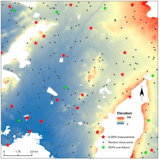 Both the orthorectified images and DSM have been produced in 2010 and are used as reference data for the present study; data gaps shown in Figure 4 concern classified areas by the Hellenic Military Services. In the absence of LiDAR-based DSM, for the validation of the produced DSM, three different approaches have been selected and used: (a) 188 random check points with elevation data from the reference dataset in of more than 50 m distance from each other (avoiding spatial autocorrelation following a rule of thumb that each point has to be at a distance of 40 times the size of a pixel []); (b) four line profiles across different areas, including urban canyons, open spaces, highway, and buildings of different use; and (c) 26 in situ measured points across the project area using Trimble R-10 GNSS units (Sunnyvale, CA, USA) and system corrections via the country ground reference stations of the HEPOS network (Figure 4). These have been measured at pavements corners and on roof corners of buildings but also within street canyons. RMSE, a comprehensive statistic metric, has been selected as the evaluation metric of the accuracy of the produced DSM. Linear errors at 95% and 99% confidence intervals (CI) have been calculated from the RMSE.