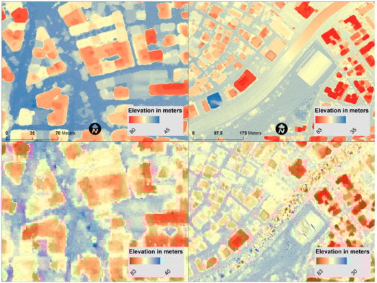 DSMs are incorporated in the process of image classification in urban/rural areas, for a holistic approach of land use/cover with improved results [], or a targeted image classification, as is the case of urban green vegetation [], but also in the process of the extraction of buildings [,], which resulted in more accurate results. The incorporation of DSMs in mapping elements in urban environments can benefit the current research by improving the results by incorporating texture and shape information apart from the spectral information [,]. It is important to state that moving object detection over same dataset resulted in advanced datasets, which is important for studies in urban environments [].