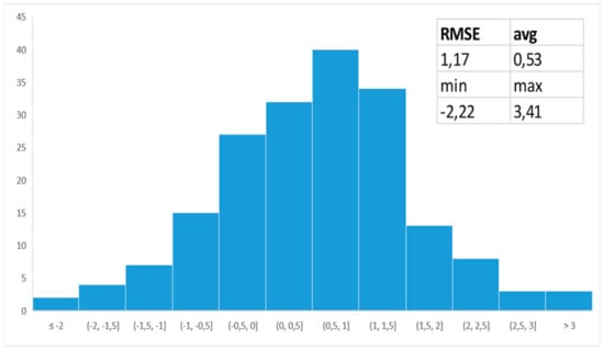 The probability distribution of error, the means correspond to biases (systematic effect) and the variances correspond to random effects; values are in meters. RMSE is at 1.17 m.