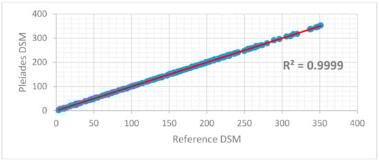 The reference DSM is a post-processed dataset (break lines to correct edges and roads removing moving objects), smooth and ready-to-use in analysis, while the produced DSM from Pleiades has not been post-processed. Thus, spikes and artifacts that are visible at Figure 9 will be removed during a post-process analysis.