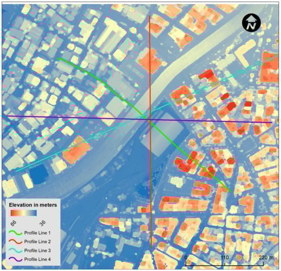 The profile lines above different urban features overlaid at the reference DSM.
