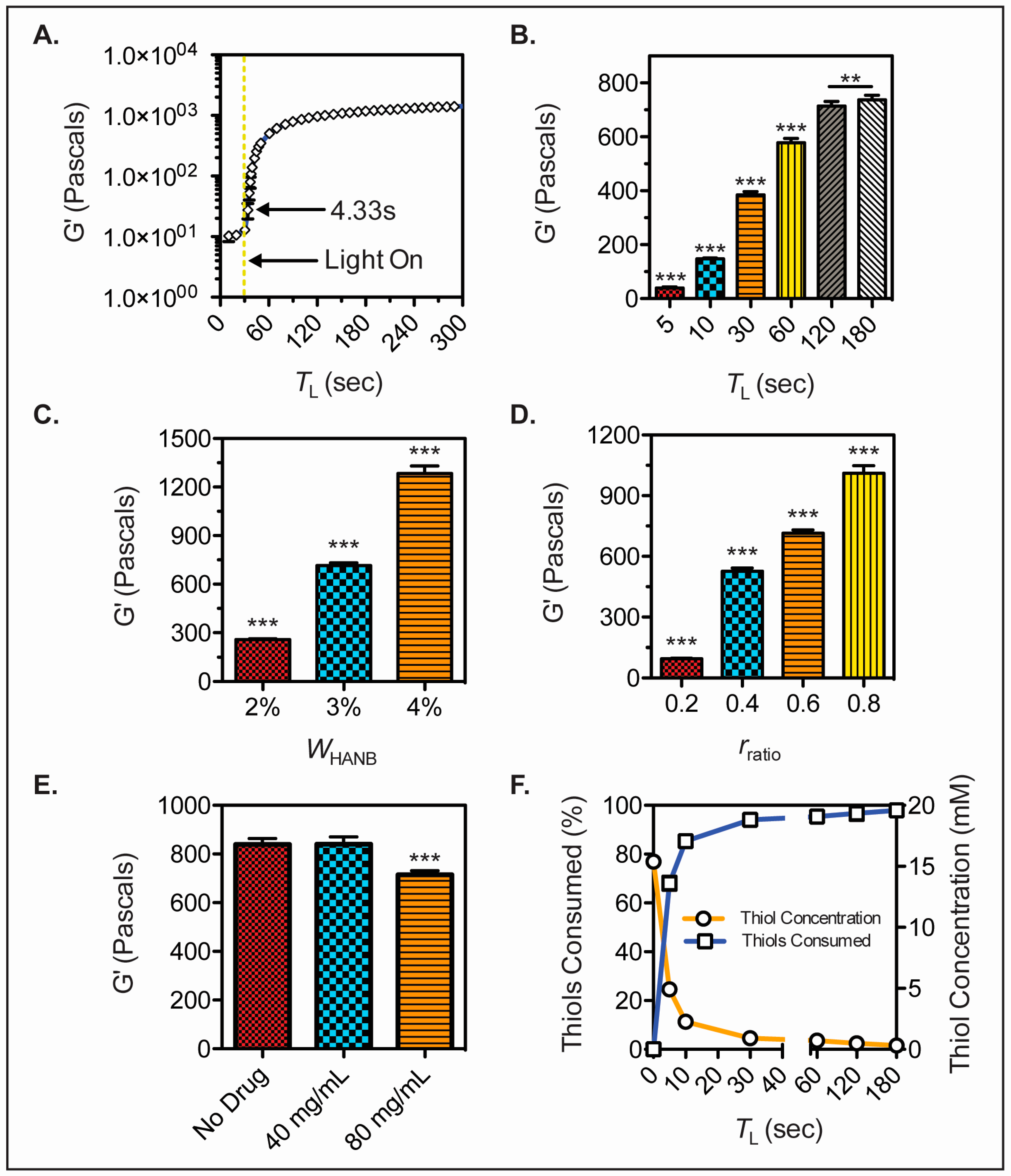 HANB hydrogel mechanical properties. (A) In-situ photorheology of hydrogel solution (WHANB = 3%, rratio = 0.6, TL = 2 min) indicating gelation kinetics; (B) G’ of hydrogels (WHANB = 3%, rratio = 0.6) exposed to different visible light exposure times; (C) G’ of hydrogels (TL = 2 min, rratio = 0.6) with varying WHANB; (D) G’ of hydrogels (WHANB = 3%, TL = 2 min) with varying rratio; (E) G’ of hydrogels (WHANB = 3%, rratio = 0.6, TL = 2 min) with increasing Ropinirole HCL concentrations; (F) Results of Ellman’s reagent test on thiol concentration over time (WHANB = 3%, rratio = 0.6, TL = 2 min). All the bioink formulations contained 80 mg/mL of Ropinirole HCL, with the exception of (E). Asterisks denote statistical significance (** denotes p < 0.01; *** denotes p < 0.001).