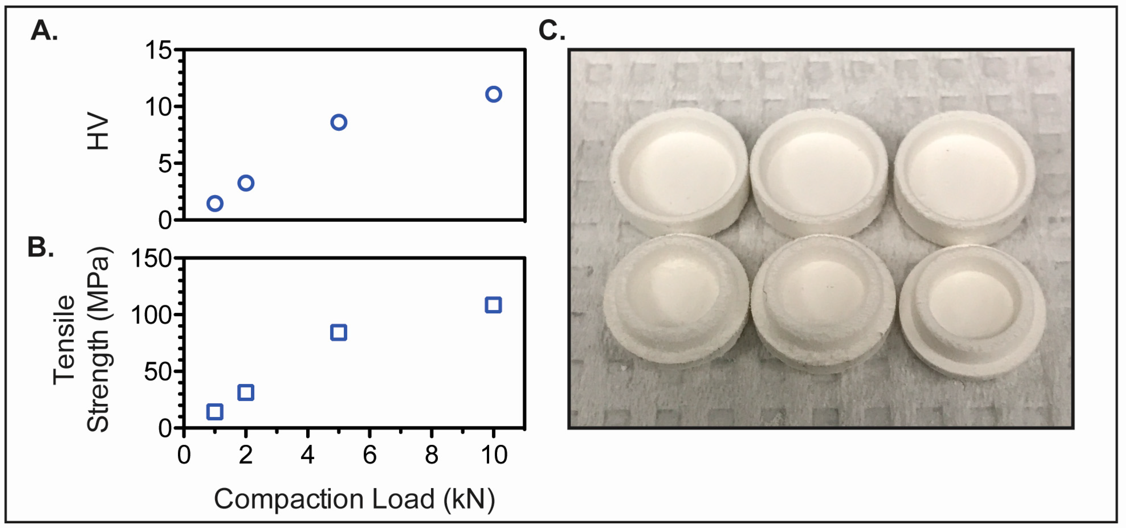 Mechanical properties of blank preform tablets. (A) Hardness (HV) and (B) tensile strength (MPa) of microcrystalline cellulose preform tablets; (C) Fabricated preform tablets.