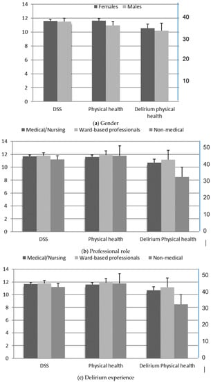Similarly, a previous history of delirium (either participants’ own experiences or delirium experienced by a family member) did not influence the extent of delirium stigma (p = 0.437). In addition, the extent of formal delirium teaching did not influence the DSS. Thus, participants who had delirium teaching over the last five years (mean = 46.68 min/year) had similar DSS scores (mean = 11.62) to those who did not have formal delirium teaching (mean = 11.60; p = 0.959). Similarly, the professional background (medical/nursing vs. ward based vs. non-medical practitioners) had little influence on the DSS scores (p = 0.781) (Figure 1a,d).