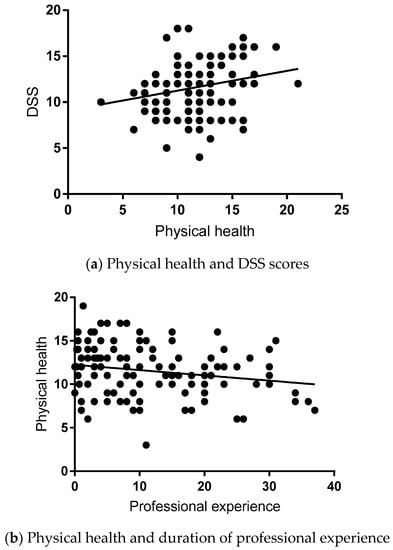 The correlation analysis highlighted the close relationship between the DSS and physical health (r = 0.237, p = 0.009; Figure 2a), whereas the length of professional experience was associated with lower physical scores (r = −0.206, p = 0.024; Figure 2b). Not surprisingly, the length of professional experience was associated with participants’ ages (r = 0.677, p = 0.0001; data not shown). In contrast, the extent of delirium teaching did not influence either the DSS (r = 0.073, p = 0.395) or the physical health (r = 0.057, p = 0.539) scores, and was not linked to the length of professional experience (r = 0.043, p = 0.691) or age of participants (r = 0.014, p = 0.874; data not shown). However, it was associated with the objective measure of the physical health in delirium subjects, as measured with the EQ-VAS scale (r = −0.255; p = 0.004; Figure 1c). Thus, participants who had formal delirium training were able to correctly identify that patients with delirium had poor physical health.
